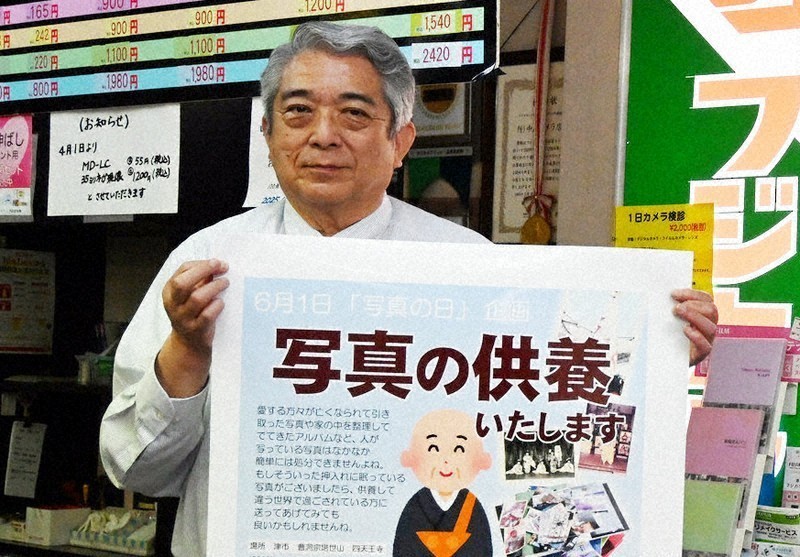 Koichi Nakao, aged 70 and the head of the "Mie Prefecture Camera Merchant Association," which includes 12 photographic shops within the region, as well as proprietor of Nakao Camera in Tsu, commented, “I trust this initiative will be advantageous for individuals desiring to preserve their photographs. Numerous people appreciate having an avenue through which they can pay respects to images of relatives whose pictures are too precious to throw away.” The location offering these services is Shitennoji Temple, recognized as the final resting spot of Horie Kuwajiro from the Tsu clan, known for bringing photography to Mie Prefecture.